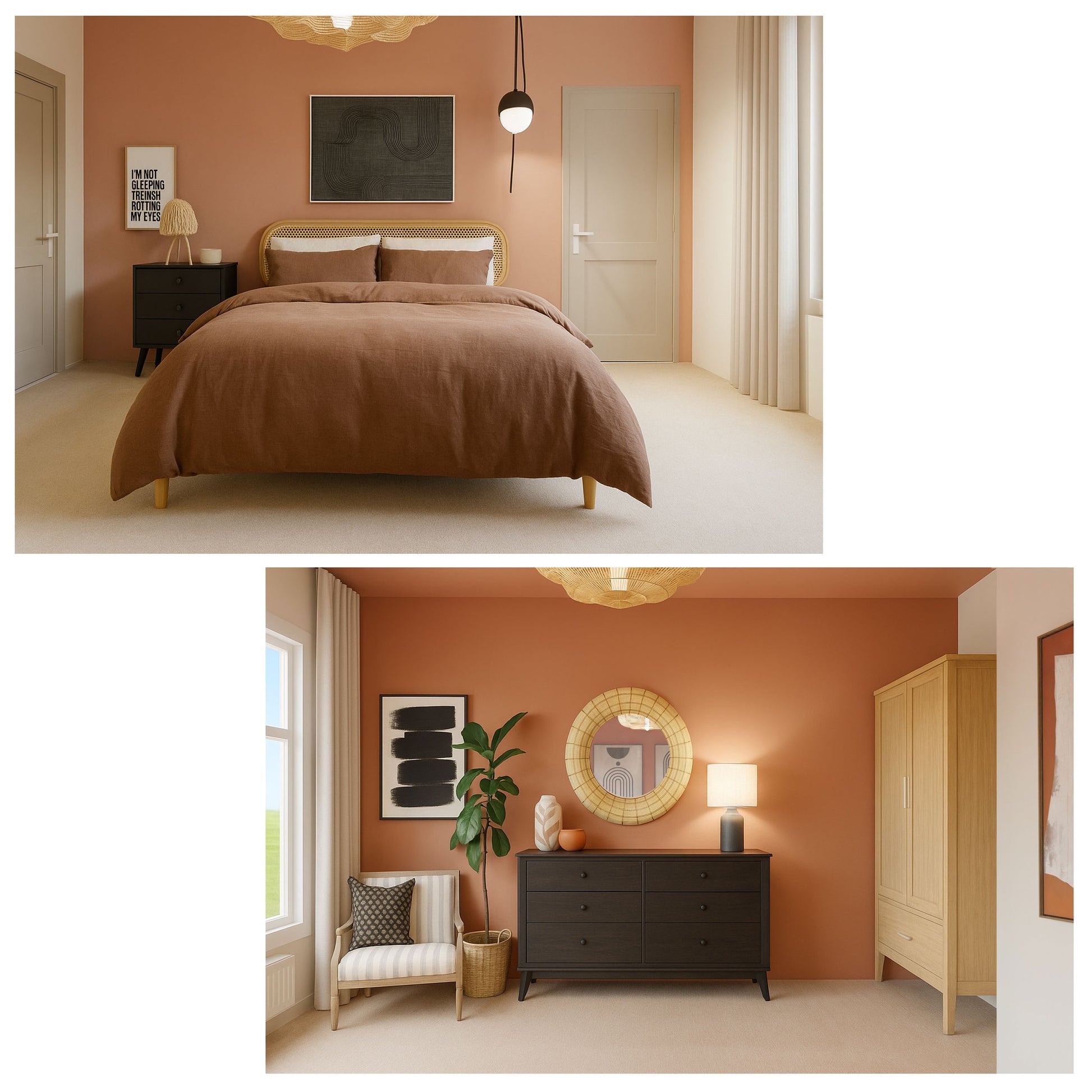 The colour palette combines rich cinnamon, rust, and terracotta tones with softer clay and beige shades, giving the room a cosy and inviting atmosphere. To balance the warmth, touches of modern black elements are added throughout the space, bringing contrast and a contemporary edge.